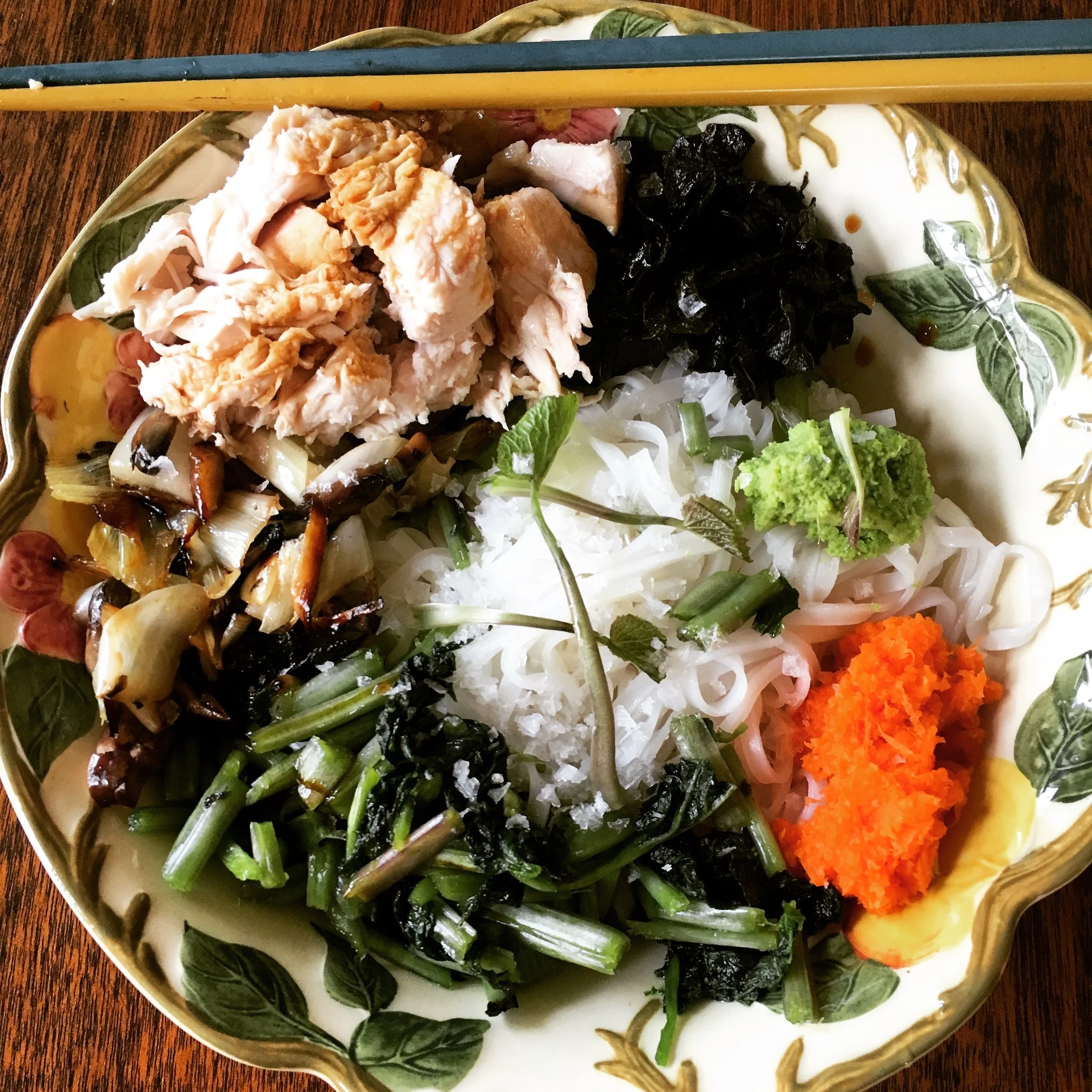 Add the prepared (as above) or raw leaves and stems to noodle or rice dishes pictured below.