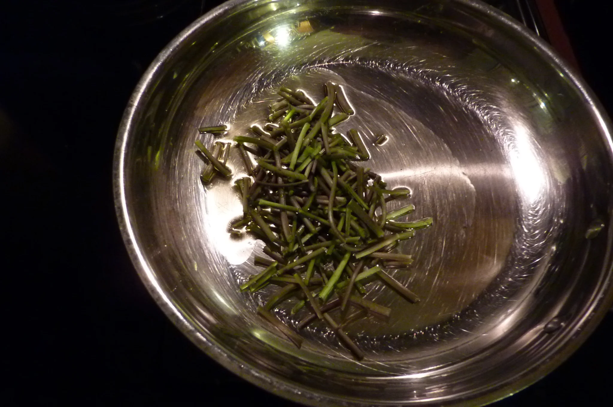 4. Sauté the stems in olive oil on low/medium heat for 7 minutes. Add the leaves at the 7 minute mark and sauté for another 2 minutes.